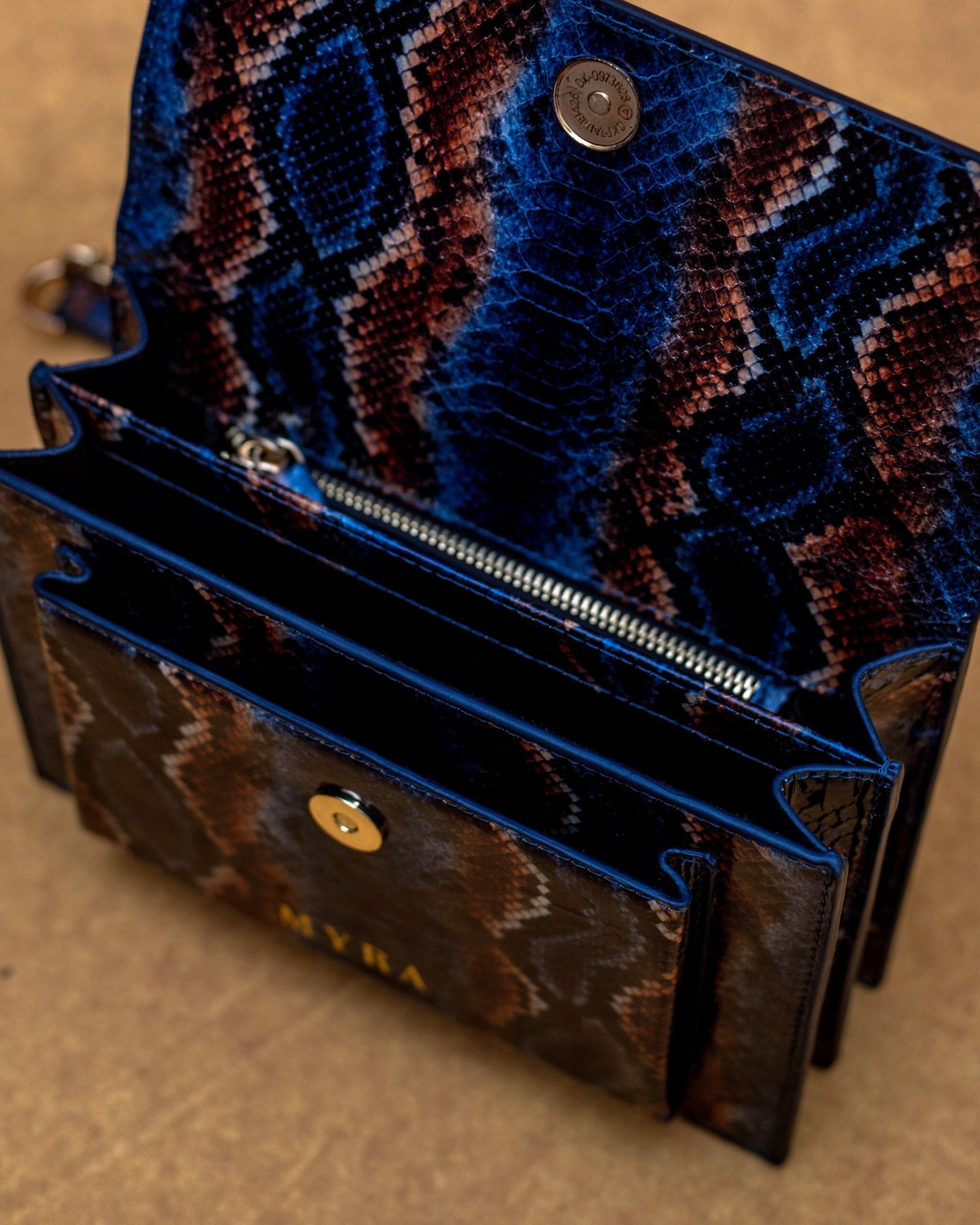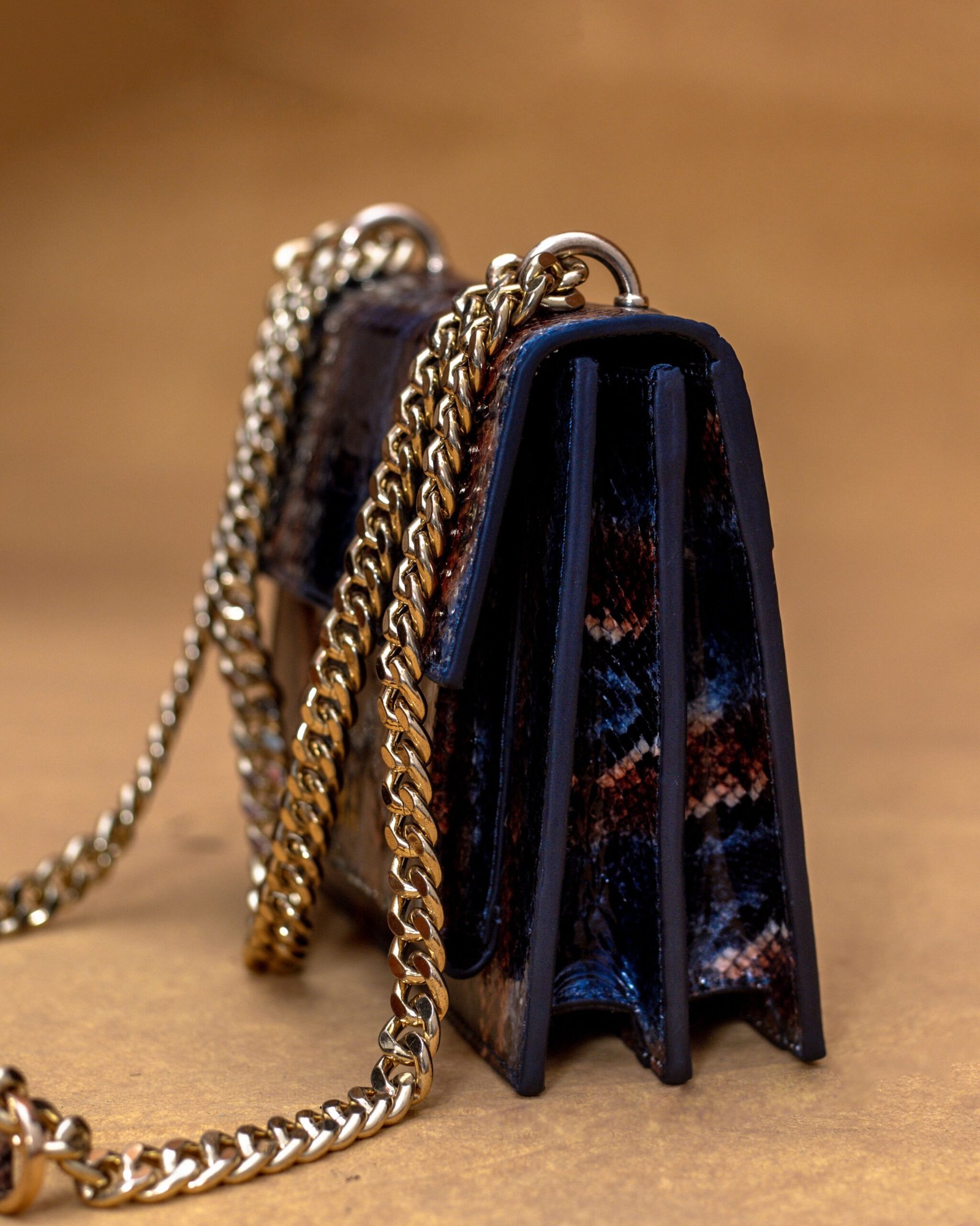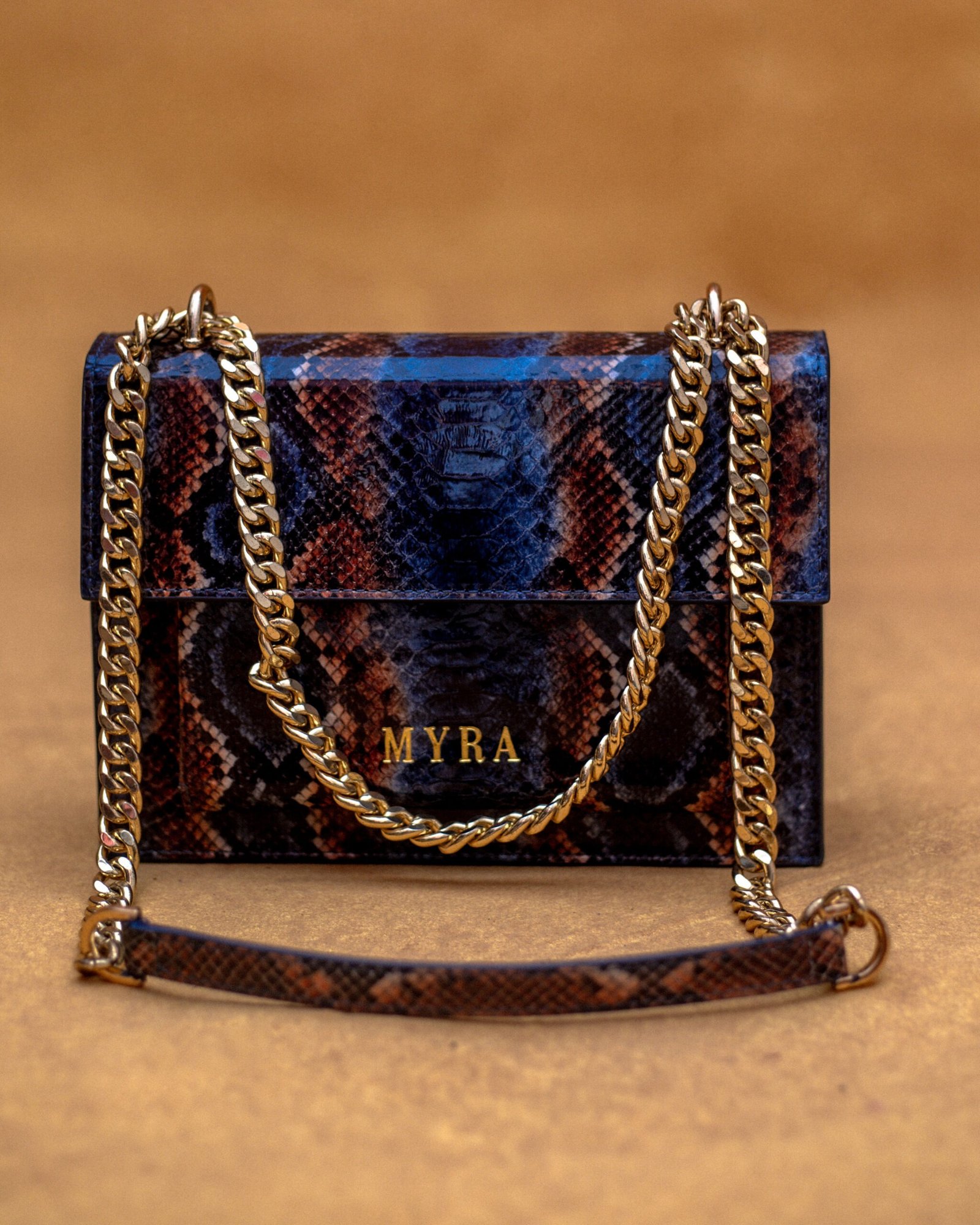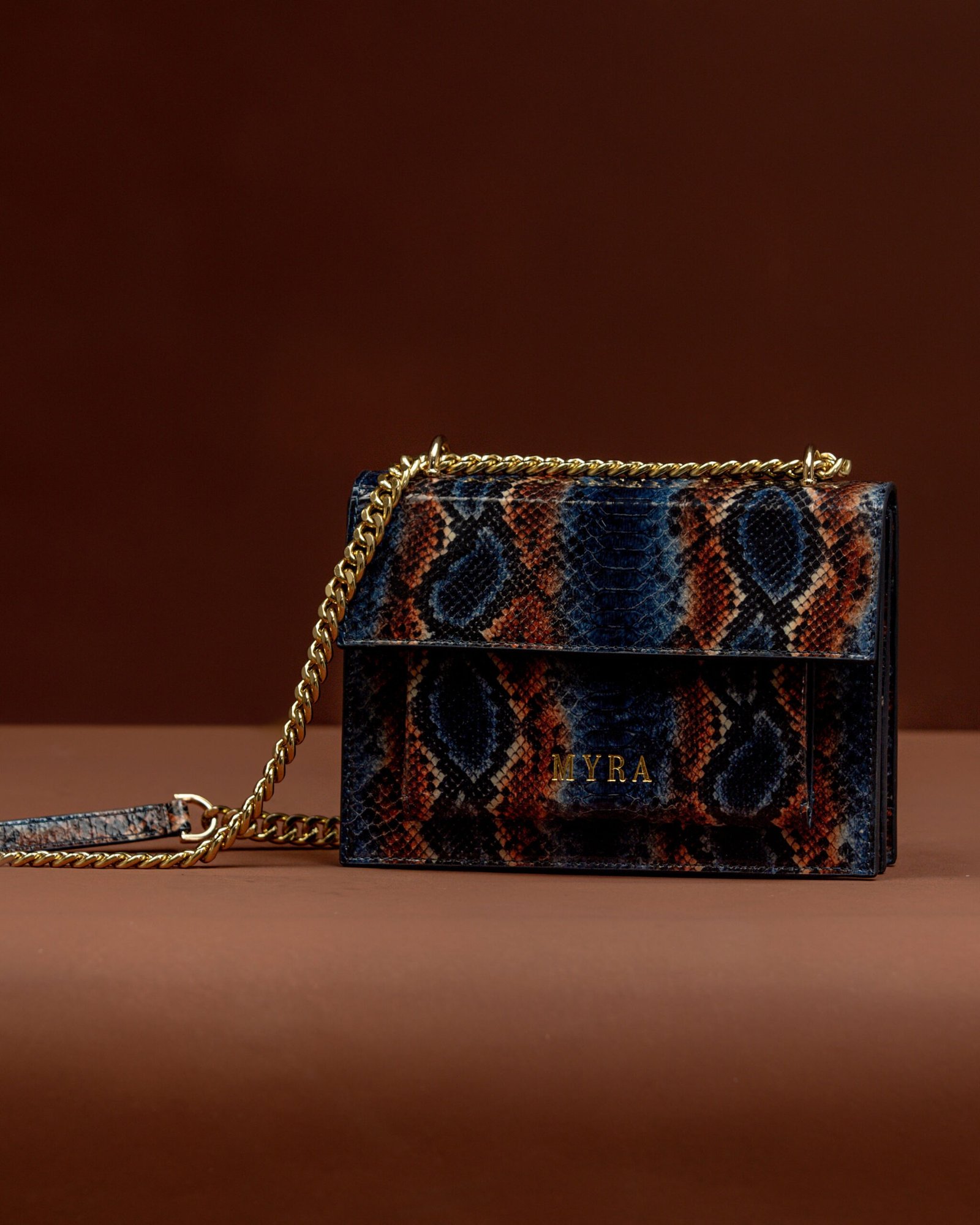 Elevate your style with the MYRACO Skin Crossbody Bag, a statement piece crafted for women who love bold, elegant accessories. Designed with a striking multi-tone snakeskin pattern, this compact luxury bag combines sophistication with everyday practicality. Finished with a gold-tone chain strap and the signature MYRACO emblem, it transitions effortlessly from daytime chic to evening glam.